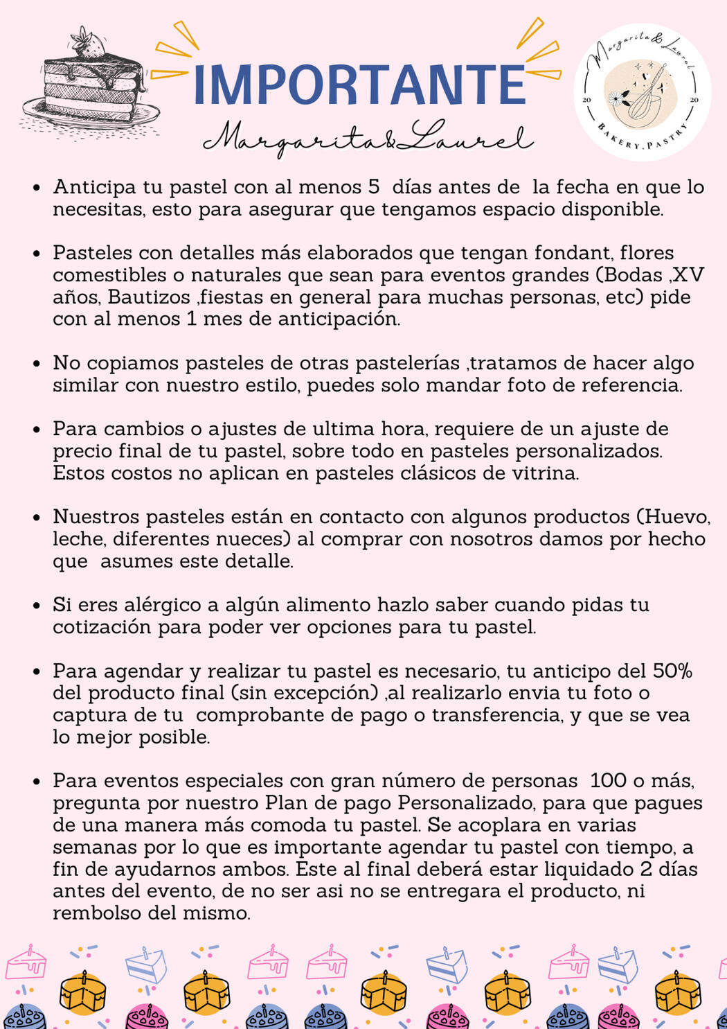 En esta sección podrás encontrar la información necesaria para anticipar tus pedidos, los cuidados que se requieran al recibir el producto y políticas de nuestra marca.